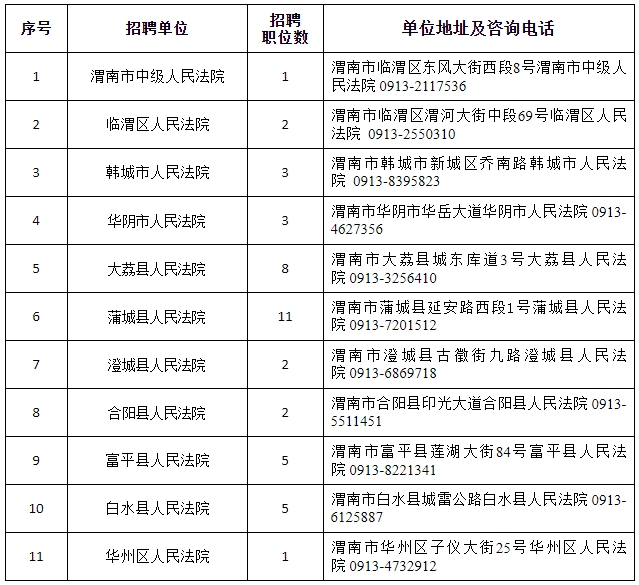 根據(jù)工作需要及相關(guān)政策規(guī)定,經(jīng)陜西省高級人民法院批準(zhǔn),渭南市法院系統(tǒng)面向社會公開招聘聘用制書記員?,F(xiàn)將有關(guān)事項公告如下: